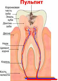 Пульпит - воспаление нерва зуба, которое происходит в результате сильного разрушения тканей с проникновением инфекции в полость, где находится нерв.